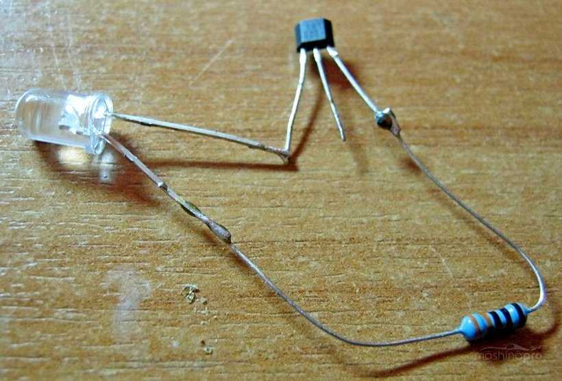 Для замера сопротивления потребуется резистор (1 кОм), диодная лампочка и провода. К ножке лампочки припаивается резистор, а к нему подсоединяется провод. Второй провод фиксируется на второй ножке лампочки.