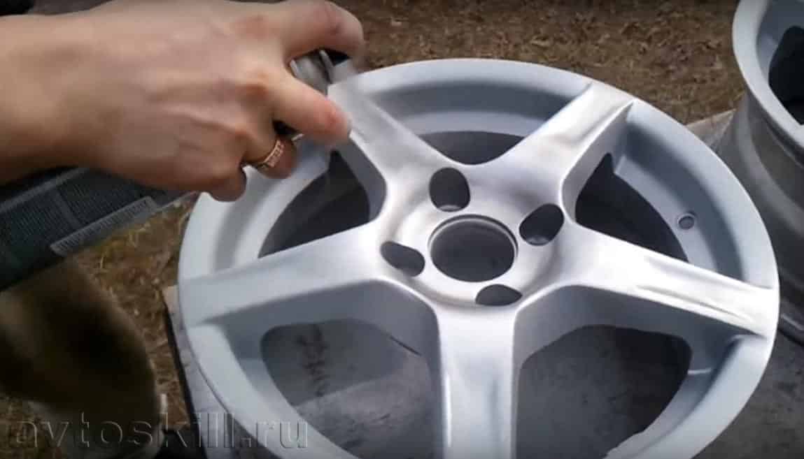 Подготовка необходима, чтобы избавиться от старой покраски и убрать появившиеся изъяны на дисках. Проводится зашкуривание и нанесение шпаклевки, чтобы выровнять основание. Время высыхания шпаклевочного раствора зависит от температурного режима. На упаковке указывается срок при +20-25 градусов.