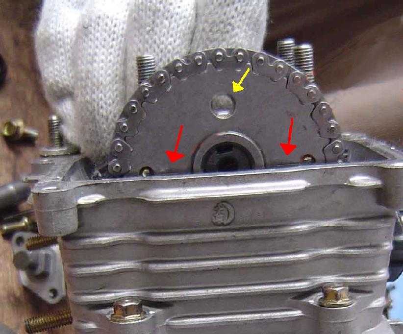 Далее снимаем цепь ГРМ с о звезды распредвала и прокручиваем распредвал так что бы метки на звезде совпадали с краями головки цилиндра, надеваем цепь ГРМ.