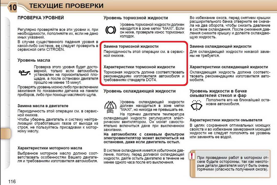 Фрагмент руководства по эксплуатации Citroen C3 Picasso о типе применяемой тормозной жидкости