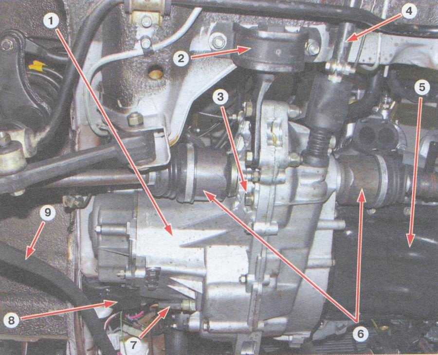 Коробка передач ваз 2108, ваз 2109, ваз 21099 (вид снизу): 1 — коробка передач; 2 — задняя опора двигателя; 3 — пробка маслосливного отверстия; 4 — тяга привода переключения передач; 5 — двигатель; 6 — внутренние ШРУСы; 7 — выключатель света заднего хода; 8 — левая опора двигателя; 9 — растяжка