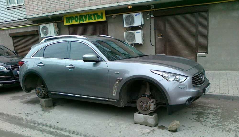 Не стоит исключать применение варварских методов, когда злоумышленники просто берут арматуру или лом, выламывают болты и убегают вместе с шинами. Подобные методы самые неприятные. Автовладелец лишается не только покрышек, но также рискует столкнуться с необходимостью проведения дорогостоящего ремонта крыльев и суппортов.