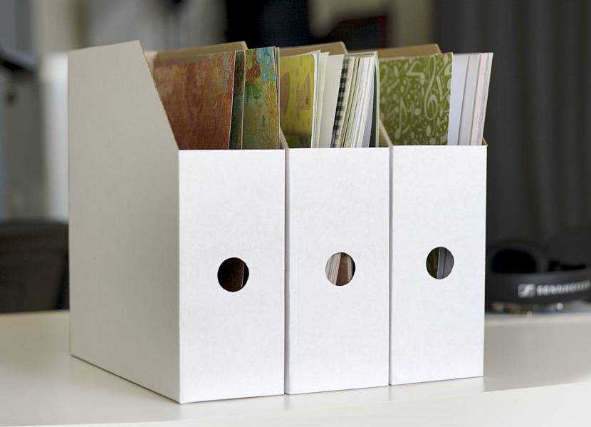 - Картонные и пластиковые коробки. Нужны, если документов действительно много. Выбирайте такие модели, где папки можно хранить вертикально; папки, сложенные стопкой — не самый практичный способ.