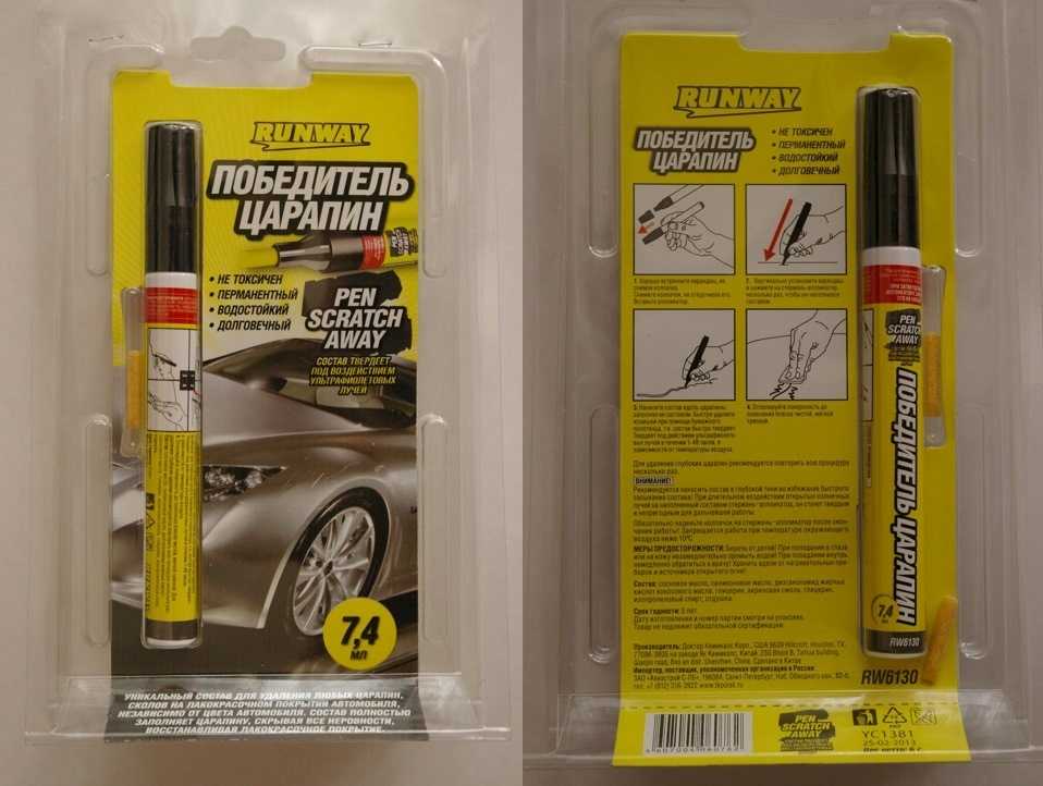 Как говорит реклама – это «победитель царапин». Доля правды в этом утверждении есть. Оригинальность данного средства в том, что оно не требует подбора по цвету. Принцип действия заключается в растворении «родной» краски, которая находится вокруг, а после использования маркера затягивает дефектное место. То есть «в цвет» вы попадете на 100%. Хорошее средство для ликвидации не слишком глубоких царапин. Минус: если заделывать слишком большое пятно (скол), оно будет заметно из-за неровно уложенного слоя средства, в отличие от эмали, которая ляжет гладкой каплей. Способ применения такой же, что и у средства, описанного выше. Стоимость Runway — от 140 руб. (флакон объемом 100 мл).