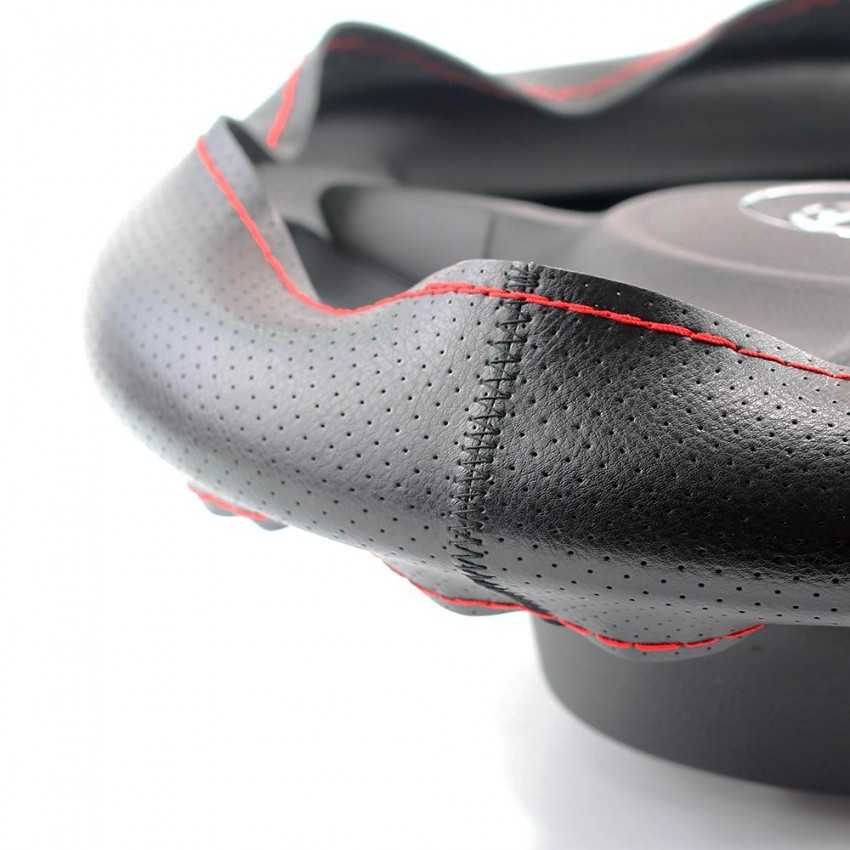 Оплетка со шнуровкой для перетяжки руля сделана из композитной кожи. Перетяжку можно выполнить самостоятельно: в комплекте идет игла и нить в цвет оплетки. Отверстия для стежков уже готовы, нужно просто провести сквозь них нить и затянуть. Оплетка прочно облегает руль, а разные виды фактуры не только защищают, но и украшают рулевое колесо.