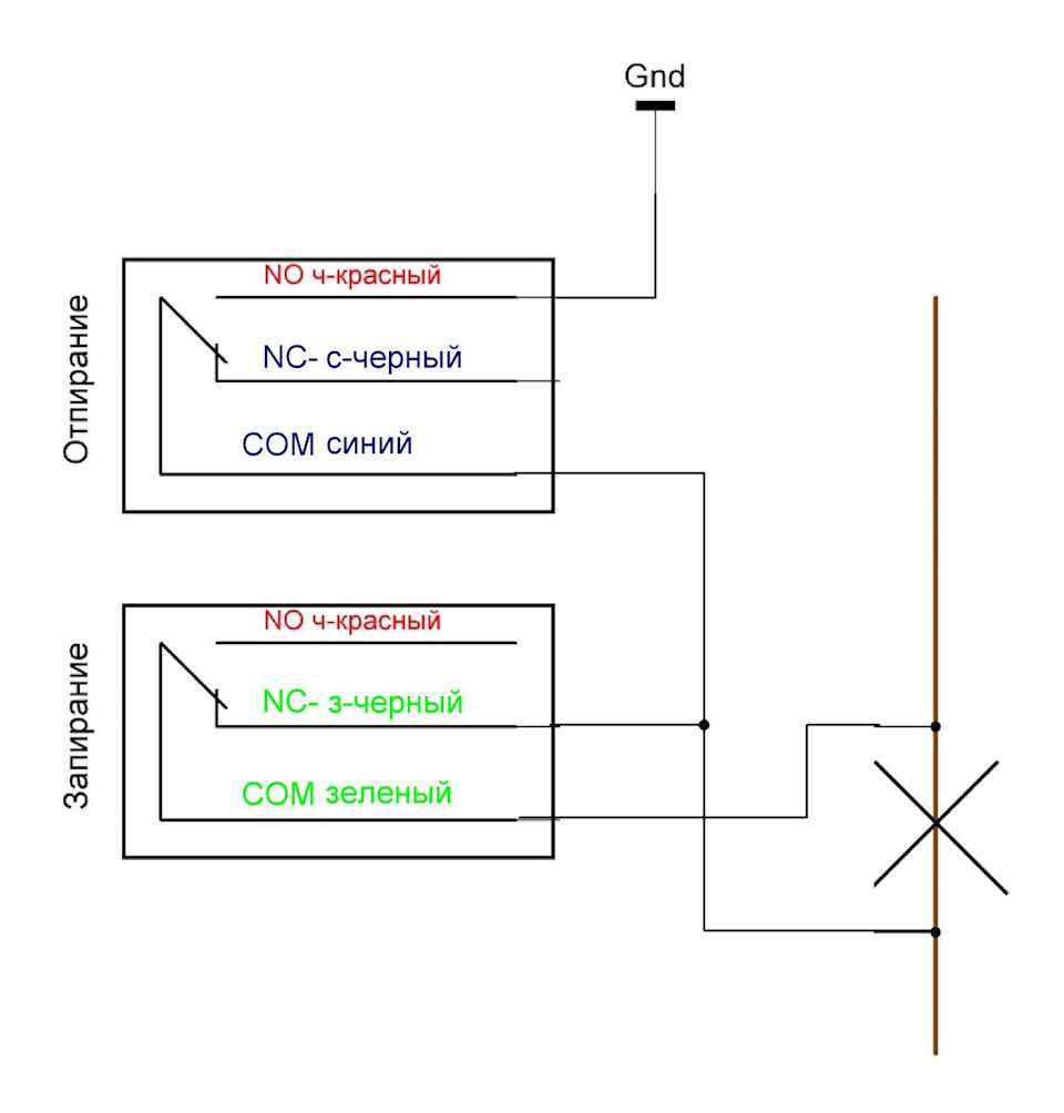 Оставшиеся замкнутые контакты в данном случае не применяются. Верхнее реле выполняет задачу запирания, нижнее предполагает открытие дверных механизмов. В место данных элементов могут быть применены сигнальные контакты.