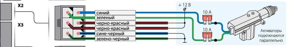 Здесь синий и сине-черный сигнал отпирания, а зеленый зелено-черный сигнал запирания.Теперь, для того чтобы двери закрылись нужно разорвать коричневый провод. Для открывания нужно соединить его и подать минус.По этому провода и разъема X2 нужно соединить следующим образом
