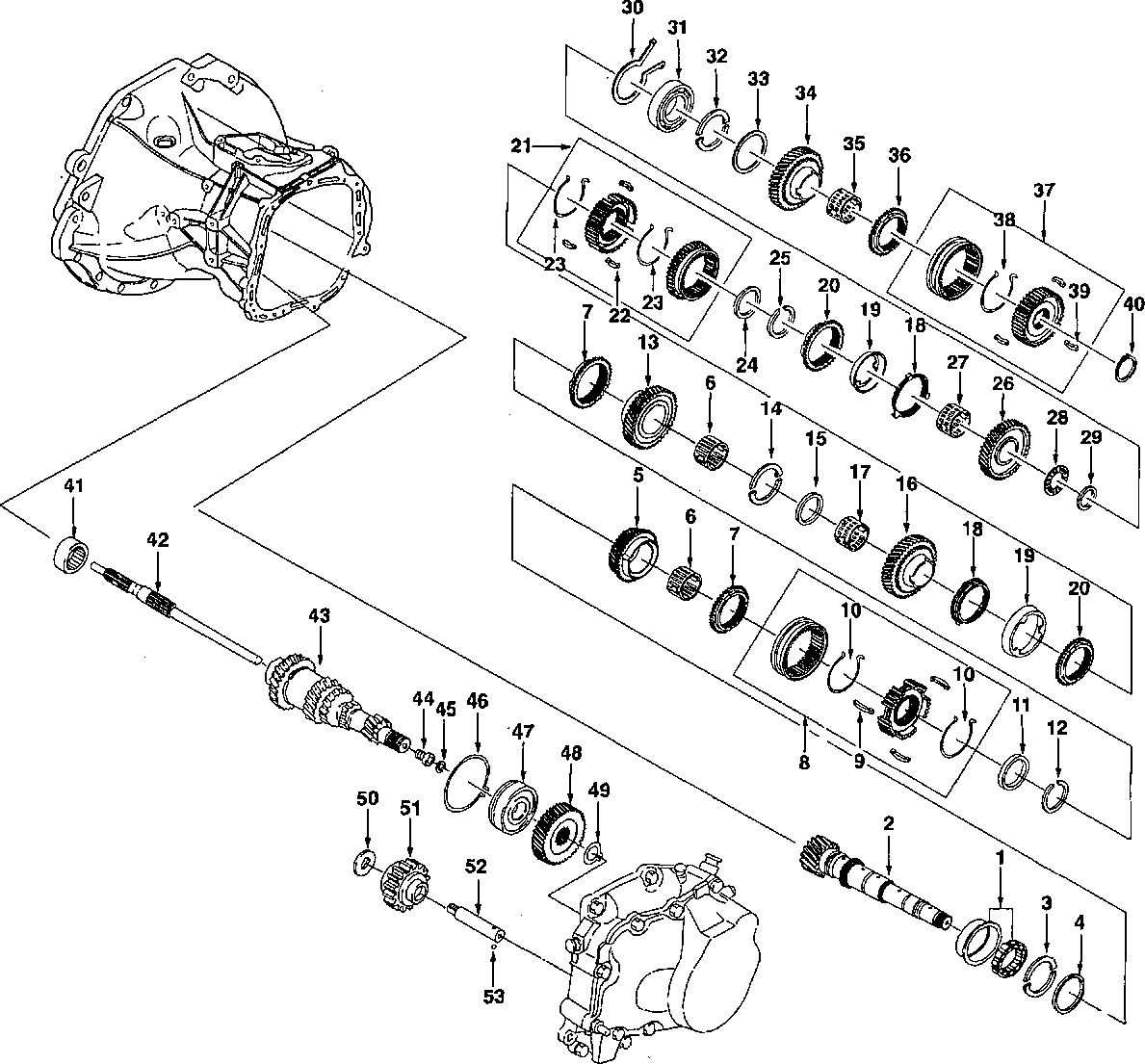 1. Роликовый подшипник, 2. Ведомый вал КПП, 3. Составная шайба, 4. Охватывающее кольцосоставной шайбы, 5. Ведомая шестерня 4-й передачи, 6. Игольчатый подшипник, 7.Блокировочные кольца синхронизатора 3-й и 4-й передач, 8. Муфта переключения 3-й и 4-й передач в сборе, 9, Сухари-фиксаторы муфты переключения 3-й и 4-й передач, 10. Пружинная распорка сухарей-фиксаторов 3-й и 4-й передач, 11. Шайба, 12. Пружинное кольцо, 13. Ведомая шестерня 3-й передачи, 14. Составная шайба, 15. Охватывающее кольцо составной шайбы, 16. Ведомая шестерня 2-й передачи, 17. Игольчатый подшипник, 18. Внутреннее блокировочное кольцо синхронизатора, 19. Промежуточное блокировочное кольцо синхронизатора, 20. Наружное кольцо блокировочное синхронизатора, 21. Муфта переключения 1 -й и 2-й передач с ведомой шестерней задней передачи, 22. Сухари-фиксаторы 1-й и 2-й передач, 23. Пружинная распорка сухарей-фиксаторов 1 -й и 2-й передач, 24. Шайба, 25. Пружинное кольцо. 26. Ведомая шестерня 1-й передачи, 27. Игольчатый подшипник, 28. Упорный игольчатый подшипник, 29. Шайба упорного игольчатого подшипника, 30. Стопорное кольцо, 31. Шарикоподшипник с пазом, 32. Составная шайба, 33. Охватывающее кольцо составной шайбы, 34. Ведомая шестерня 5-й передачи, 35. Игольчатый подшипник, 36. Блокировочное кольцо синхронизатора. 37, Муфта включения 5-й передачи, 38. Распорное пружинное кольцо сухарей-фиксаторов муфты включения 5-й передачи, 39. Сухари-фиксаторы муфты включения 5-й передачи, 40. Стопорное кольцо. 41. Подшипник ведущего вала 42. Входной ведущий вал, 43. Блок шестерен ведущего вала. 44. Болт, 45. Стопорное кольцо, 46. Кольцо подшипника блока шестерен, 47. Шарикоподшипник с пазом, 48. Ведущая шестерня 5-й передачи, 49. Стопорное кольцо, 50. Шайба 51. Промежуточная шестерня заднего хода, 52. Ось промежуточной шестерни заднего хода, 53. Шарик.