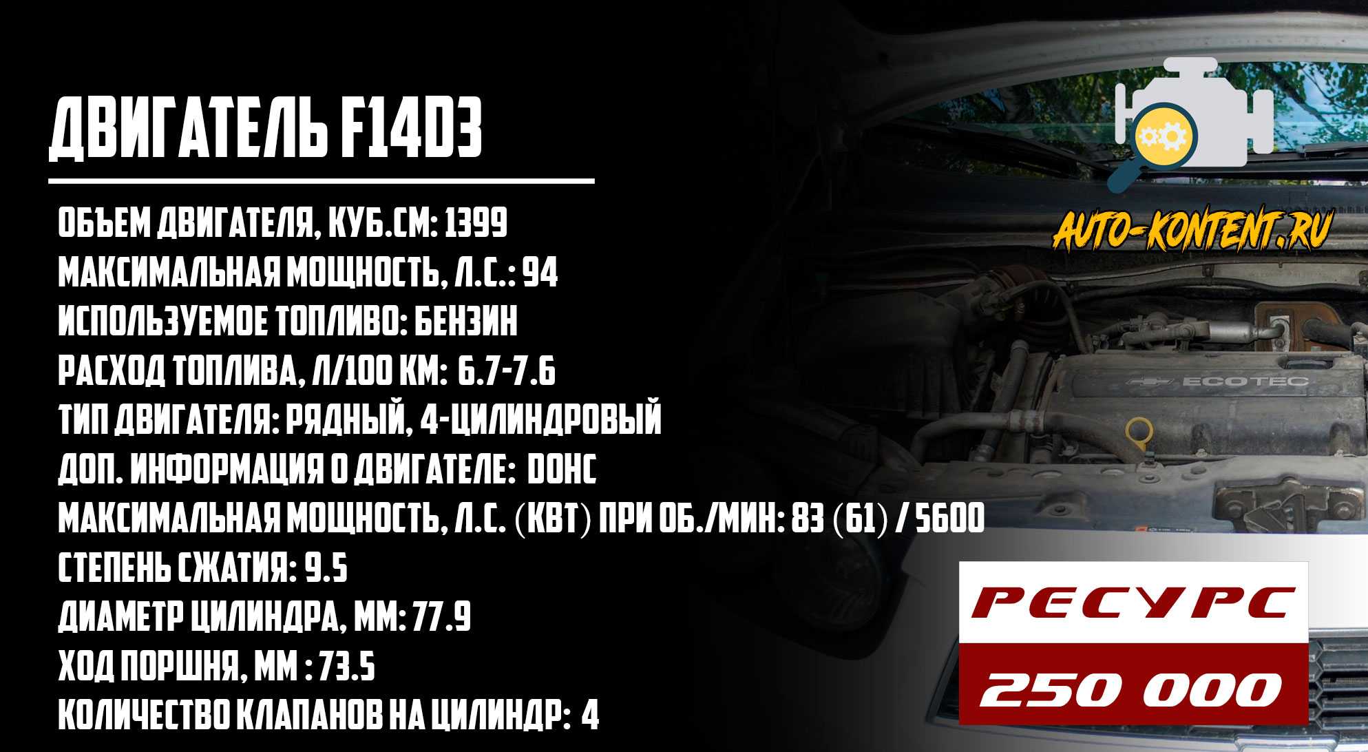 Этот 1.4-литровый двигатель собирали в Южной Корее с 2002 по 2008 год и ставили на массовые автомобили концерна General Motors, к числу которых относится и Шевроле Авео. В России автомобиль с таким мотором также были приобрести, но маркировался ДВС иначе – L95. То есть, F14D3 и L95 это два одинаковых 1.4-литровых бензиновых движка, развивающих в пике 94 лошадиные силы. Оснащен системой распределительного впрыска топлива, способен выдать 130 Нм крутящего момента. Выполнен из чугуна (блок цилиндров), ГБЦ алюминиевая, 16-клапанная. Диаметр цилиндров в F14D3 (L95) составляет 77.9 мм, а ход поршня 73.4 мм. В приводе газораспределительного механизма используется ремень.