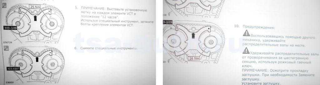 После этого можно затягивать болты муфт VCT. Для проверки фаз нужно установить ремень ГРМ, натяжной ролик, шестерню и болт коленвала. Далее вращаем коленвал головкой на 18 на два оборота, пока метки на муфтах не встанут почти вертикально, вставляем болт-упор КВ и докручиваем коленвал до упора в него. Как только упрется – ставим бабочку. Если бабочка встает без проблем и планка установится в хвостовики распредвалов — то все сделано верно, окончательно затягиваем болты шестерен VCT. Если нет, отпускаем болты элементов VCT и выставляем как надо. Далее устанавливаем заглушки (момент затяжки 16 Н∙м), вынимаем планку из хвостовиков и ставим на место клапанную крышку с новой прокладкой. Соблюдаем порядок затяжки болтов и момент. Возвращаем разъемы и клапаны vct на место. Описание дальнейшей сборки в статье о замене ремня ГРМ.