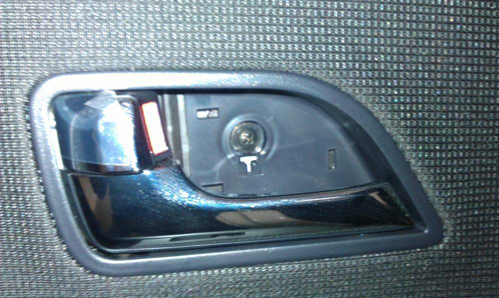 - Убрать панель ручки двери, выкрутить болт, отодвинуть рычаг ручки назад и снять деталь.