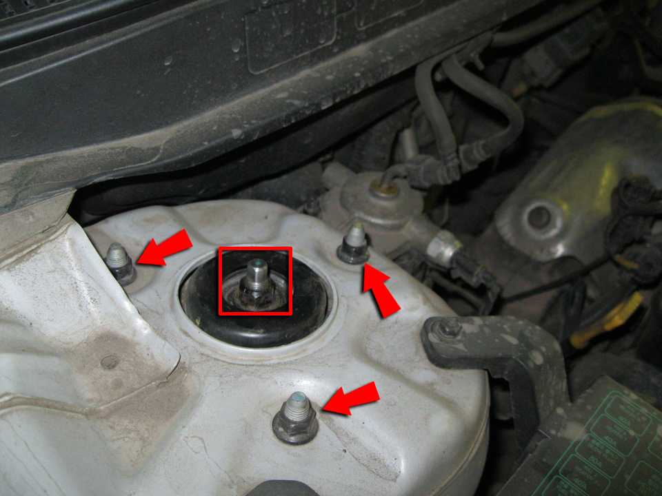 10. Ослабьте затяжку гайки штока амортизаторной стойки (показано квадратом) и открутите три крепления амортизатора к кузову (показано стрелками).