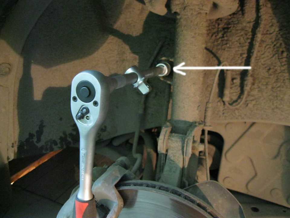 5. Удерживайте палец от проворачивания, открутите гайку пальца верхнего шарового шарнира стойки стабилизатора.