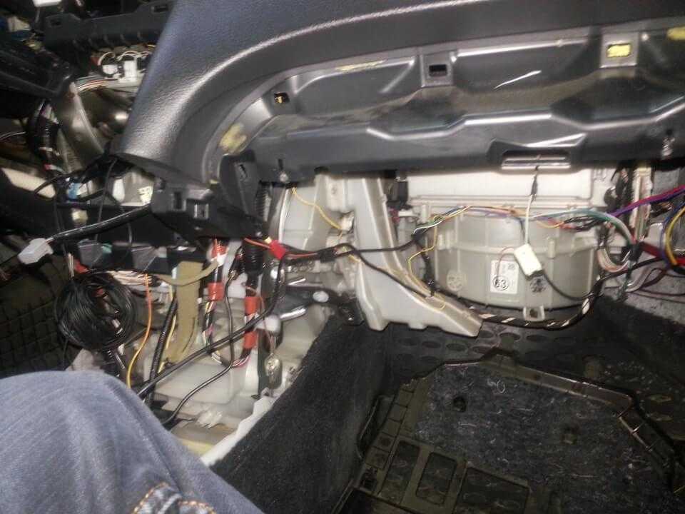 1. Предварительно нужно снять магнитолу (у меня её нет, так что тут без инструкции), стойки салона по бокам лобового стекла и пластмассовые накладки на передних порогах, затем снять нижние панели торпедо с обеих сторон — по несколько саморезов по периметру, блок кнопок климат-контроля, бардачек. Вроде это уже было в других фотоотчетах ))).