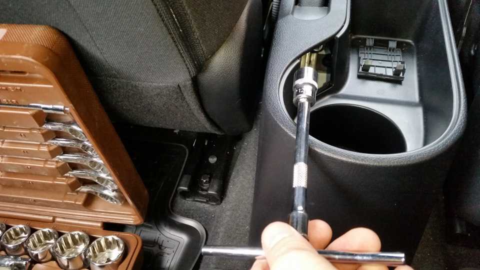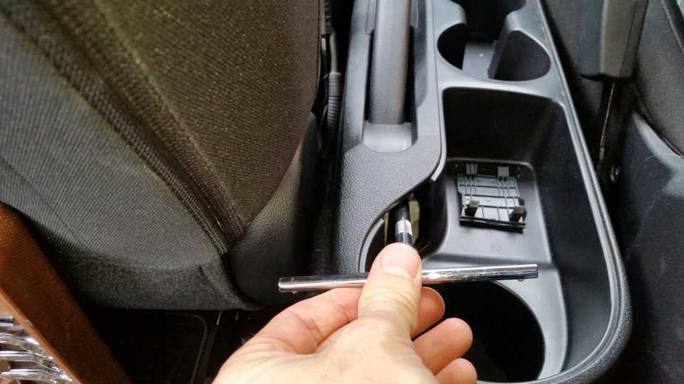 Подтяжка упомянутого узла осуществляется изнутри автомобиля, из салона. Сам механизм настройки натяжки располагается под пластиком главного тоннеля. Для выполнения процедуры регулировки необходимо наличие головки на 13 или накидного ключа, а также широкой плоской отвертки.