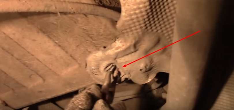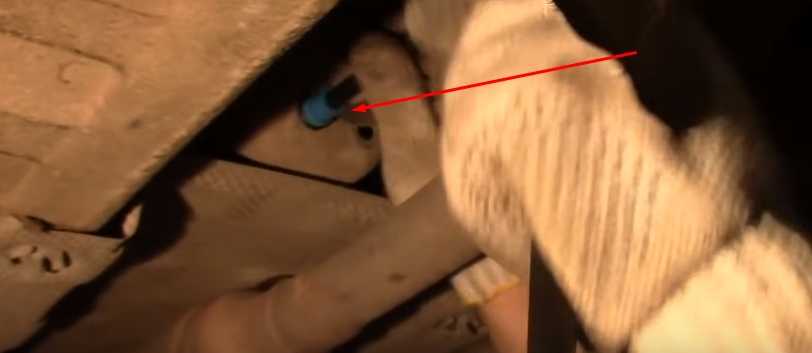 Если его не снять, мы не сможем сдвинуть только что отвинченный кожух, он будет к нему прислоняться. Резиновую подвеску глушителя можно снять с помощью обычного гаечного ключа, как показано на фото ниже.