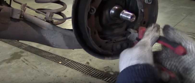 14. С помощью кусачек извлекаем трос с зацепления с колодками. Оттягиваем пружину влево и выводим трос с зацепления.