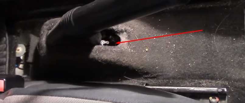 Отодвинув крышку, откроем доступ к регулировочным гайкам троса стояночного тормоза.