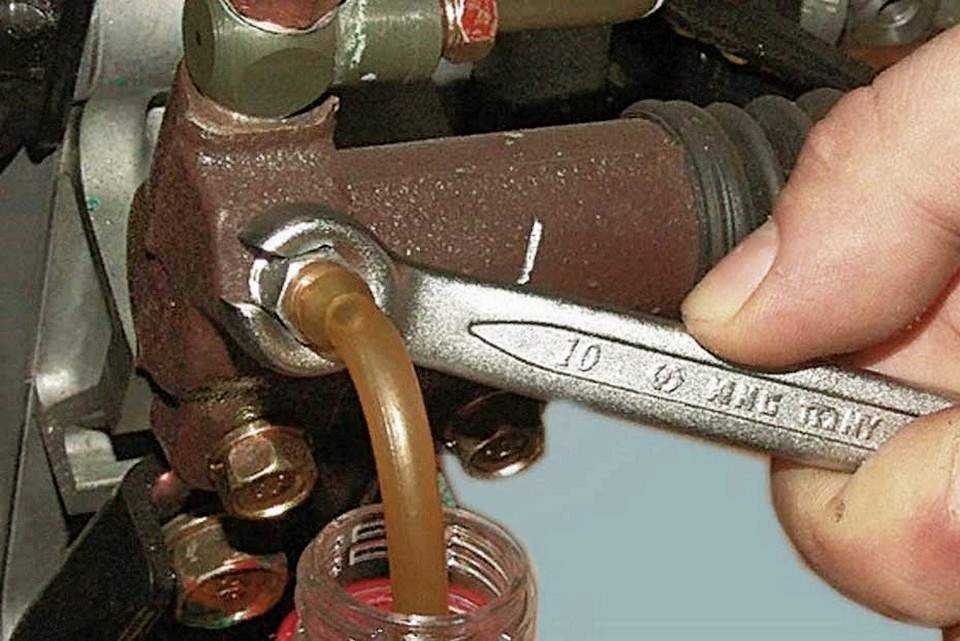 - Рожковым ключом открутите штуцер на один оборот. Через прозрачный шланг Вы увидите, как из системы выходит жидкость и воздух. Последний проявится в виде пузырьков в приемной емкости.