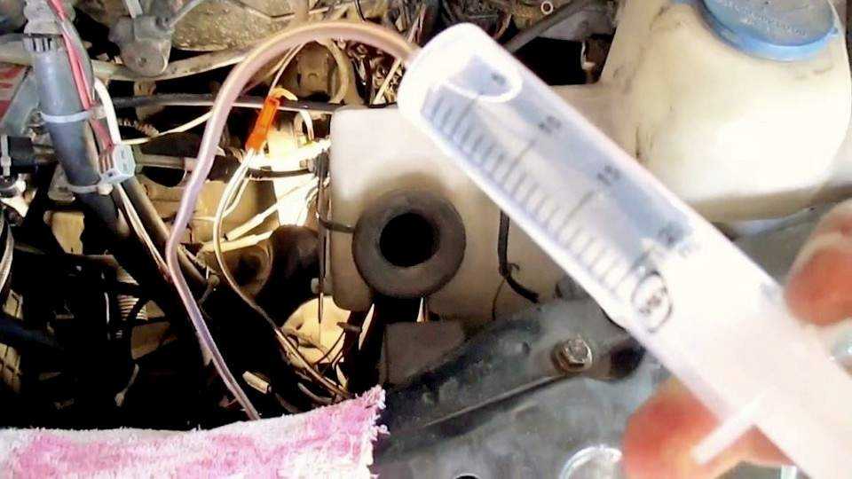 - При таком методе прокачки движение воздуха будет в обратном направлении и он выйдет через бачок. Давление создает шприц, поэтому педаль не задействована.