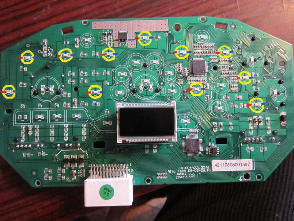 Ну вот и добрались до самих диодов.Нужно всего выпаять 11 светодиодов.Они помечены жёлтыми кружочками.Так же я указал их полярность.Красная чёрточка это плюс, а синяя соответственно это минус.