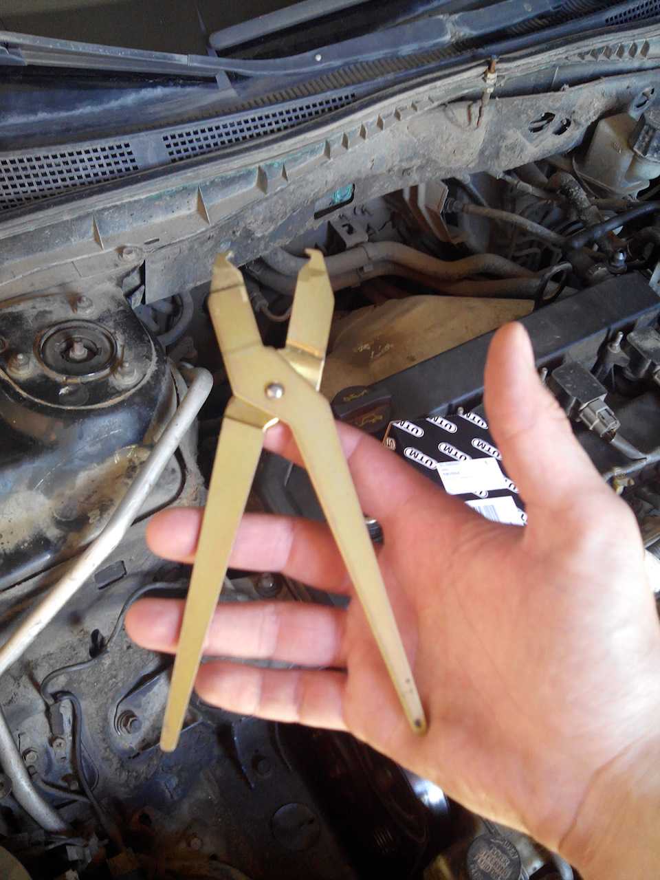 - Щипцами мастер снимает шесть пластмассовых заклёпок с подкрыльников. Доступ к шкиву помпы обеспечен, виден ролик, ремень;