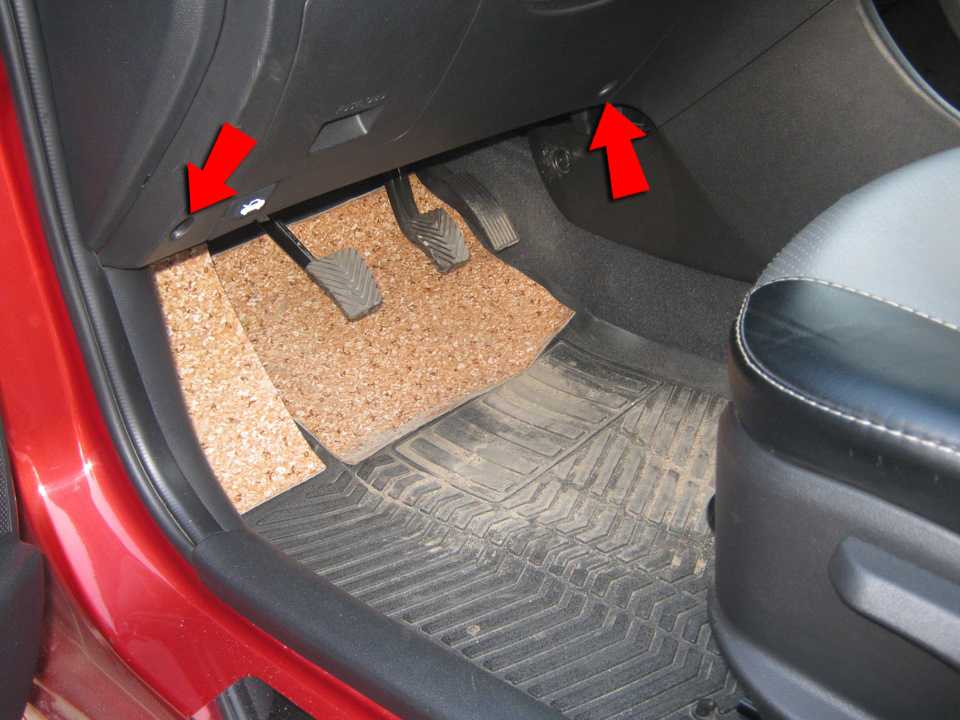 11. Отожмите фиксатор крепления нижней облицовки панели приборов.
