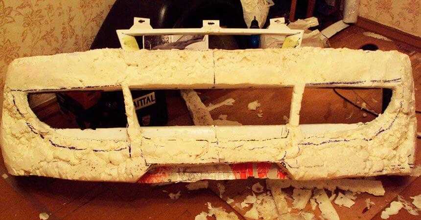 Снятый бампер оклеивается малярным скотчем изнутри в несколько слоев. Это поспособствует легкому отделению застывшей пены от шаблона. Также на малярном скотче довольно удобно делать разметку будущих деталей бампера. После оклеивания наносится пена равномерным слоем. В этом незаменимым будет пистолет для монтажной пены. На этом этапе следует позаботиться о том, чтобы не нанести материала слишком много, так как толстый слой ненужной пены будет довольно долго сохнуть.