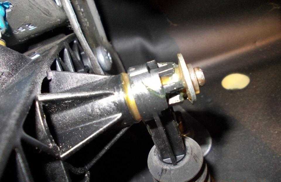 - Затем вытаскиваю демпфер оболочки троса из крепления, которое располагается в картере коробки переключения передач.