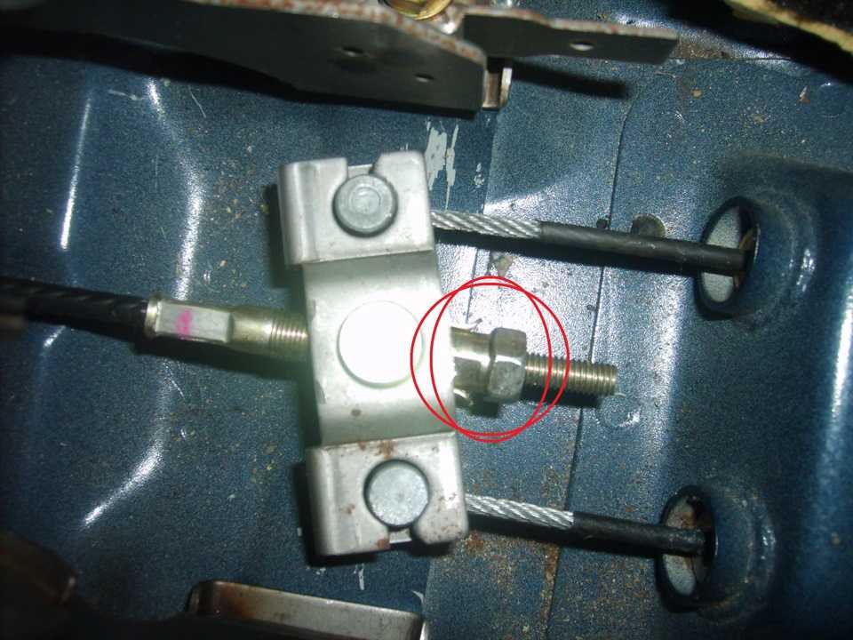 6. Так же бывают случаи когда регулировка не работает. Не работает из-за того что попускается гайка ручника на тросике. Поднимите подлокотник и найдете ее. Чтобы ее закрутить нужен ключ на тринадцать.