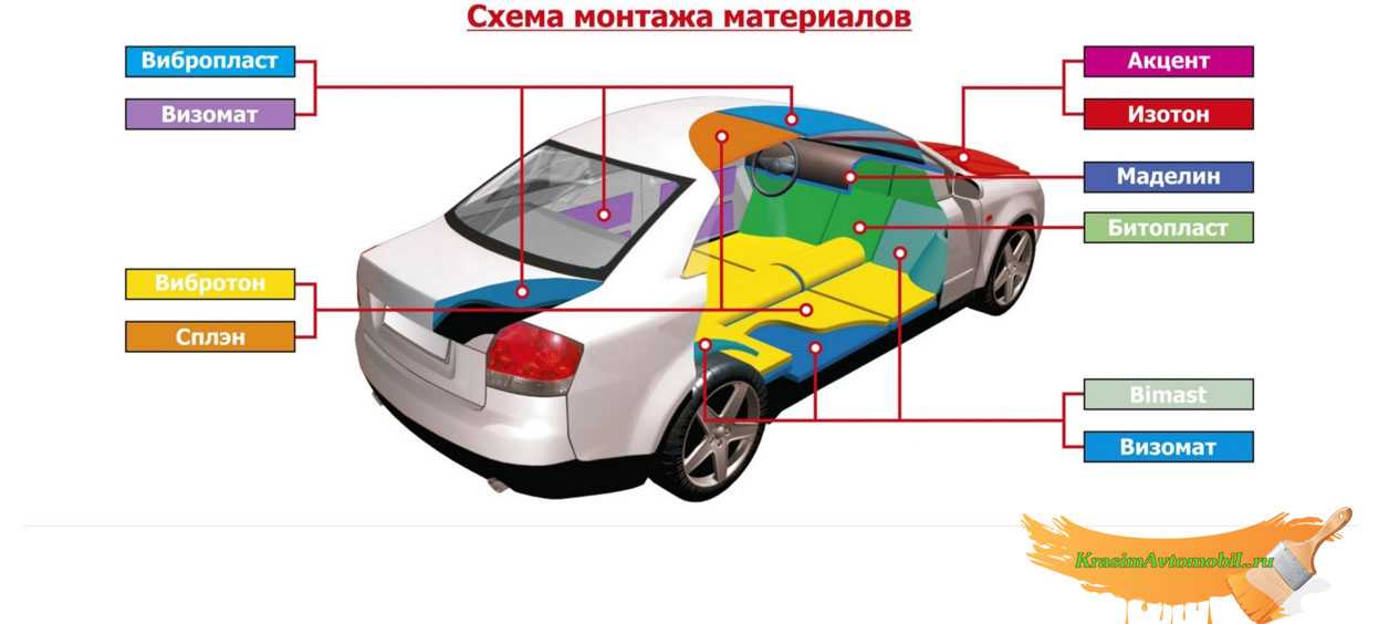 Для целей виброизоляции основное внимание уделяют обработке двигательного отсека и капота, а также дверей. Со скрипом борются обрабатывая стойки и другие силовые элементы кузова, крышу автомобиля и места соединения приборной панели, а также различных накладок