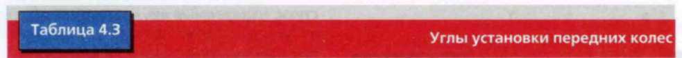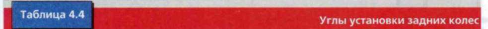 Углы установки передних колес при собственной массе автомобиля приведены в табл. 4.3, углы установки задних колес при собственной массе автомобиля — в табл. 4.4.
