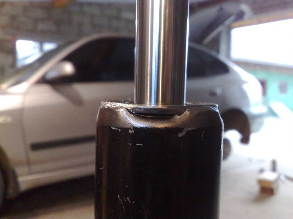 - 7. Удерживая амортизатор вертикально, штоком вверх, выполните контрольную операцию (резкими, но короткими движениями штока убедитесь в плавном, без провалов, перемещении поршня). В качественно прокачанных амортизаторах поршень перемещается плавно. Теперь аккуратно соберите заднюю стойку Hyundai Accent не переворачивая амортизатор, до его установки на машину.