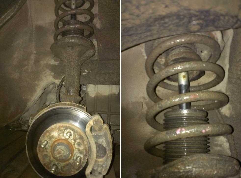 Бывают случаи, когда происходит поломка одной или обоих, задних пружин, что приводит к сильному стуку. Кроме этого, под концы каждой пружины подкладываются прокладки из резины, которые со временем разбивает и выдавливает с места их установки, что также приводит к появлению стуков.