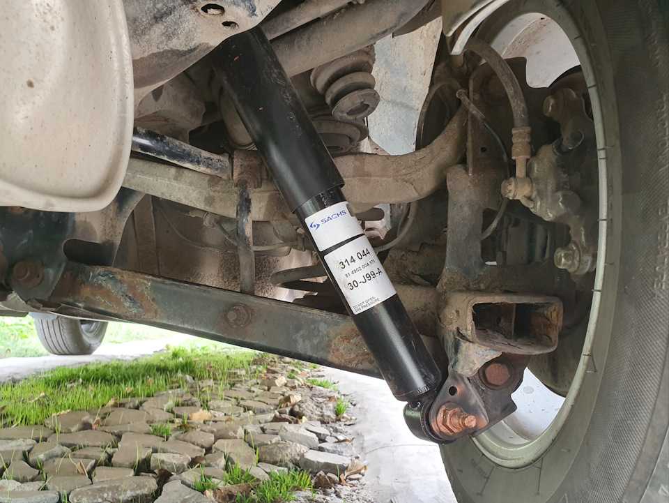 - Снимаем старый задний амортизатор, прокачиваем новый и устанавливаем на место, закручиваем сначала верхнюю гайку, потом болт снизу, ставим колесо и убираем домкрат.