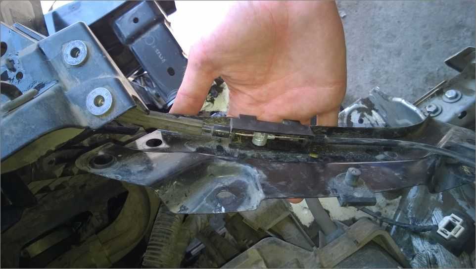 Но я бы под телевизор положил доски, мало-ли, чтобы он был на уровне как прикручен. Сразу придумайте как будете держать капот, тк потом настанет время и распорку придётся убрать. Откручиваем 2-е направляющие бампера, в них по 4 болта, и по хорошему нужно запомнить как они стояли, тк потом, когда будете ставить бампер, с ними будет головняк… зазоры будут зависеть от того как вы их прикрутили, я раз 6 туда сюда бампер дёргал и перекручивал их: Далее откручиваем «железки» сверху, 3-и болта, белые кружки на фото: Далее, левую снимаем и откладываем, а в правой идёт тросик капота, там небольшой «боксик» с соединением, раскрываем его, и отсоединяем трос: Ну тут всё понятно Далее откручиваем по 2-а болта, с обеих сторон, от телевизора, в районе лонжеронов.