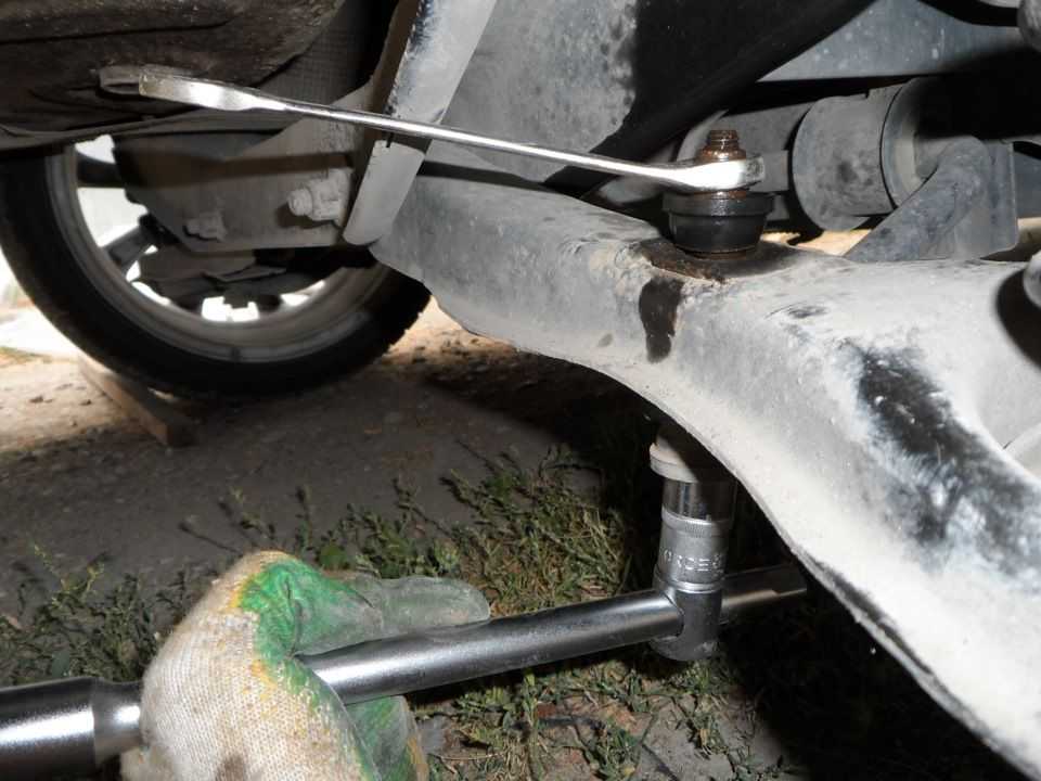 Тот же самый принцип, что и с тягами заднего стабилизатора. Стойки стабилизатора откручивайте при помощи того же ключа и того же шестигранника. Только, начинайте с верхней гайки, так тяга (стойка) стабилизатора опустится вместе со стабилизатором и вам не придется двигать сам стабилизатор вверх.