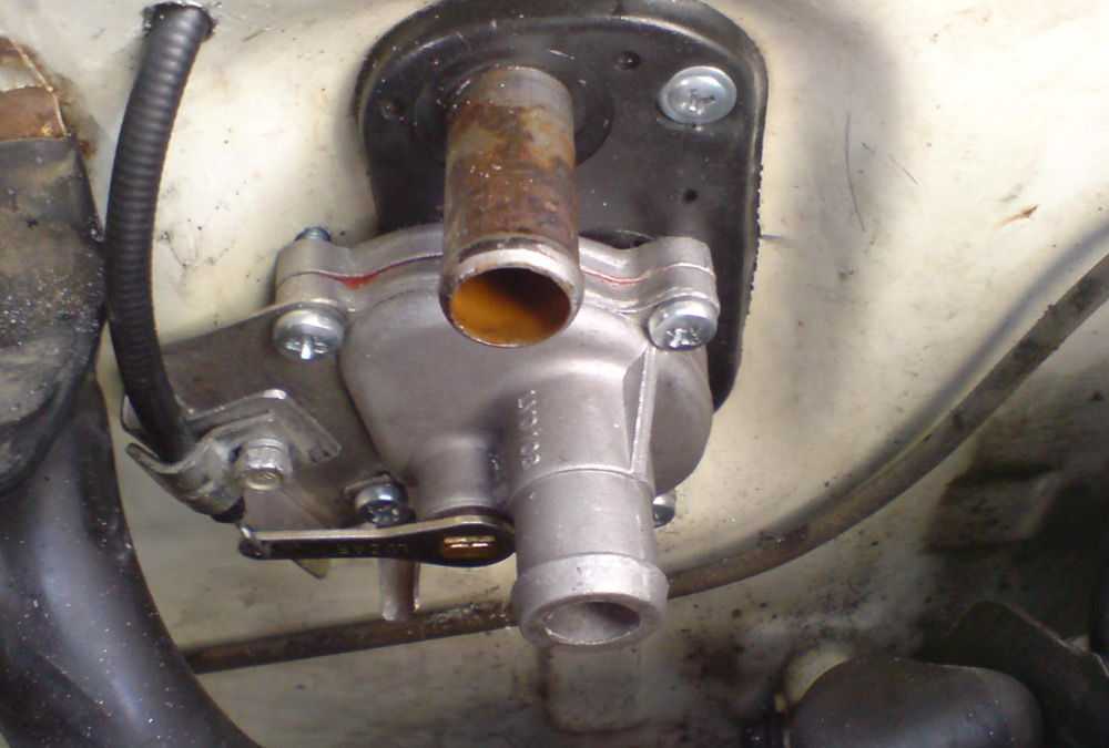 Краник отопителя, состоящий из корпуса с двумя парами патрубков, подсоединен к системе охлаждения резиновыми шлангами. Циркуляцию жидкости через радиатор осуществляет насос системы охлаждения. На подводящей магистрали в корпусе крана на оси установлен пластинчатый клапан крана, имеющий отверстие пропускающее охлаждающую жидкость. Рычаг клапана соединяется тягой с рычагом рукоятки, которой можно управлять подогревом воздуха. При повороте этого рычага отверстие в клапане откроет магистраль, чтобы жидкость стала поступать в радиатор. Тут подробнее о замене крана отопителя.