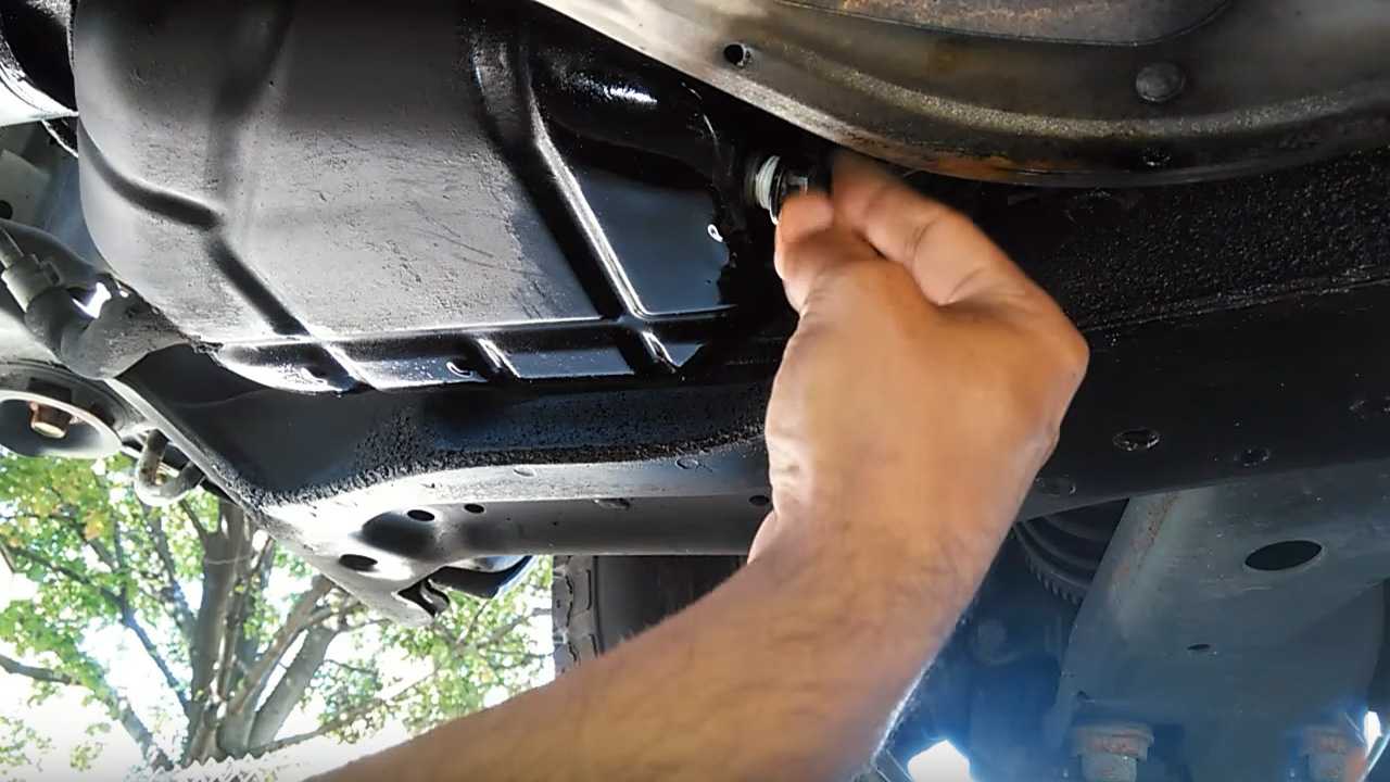4. Очищаем пробку сливного отверстия на масляном картере, отворачиваем ее. Будьте очень осторожны: масло горячее. Работайте в перчатках, чтобы не обжечь руки.