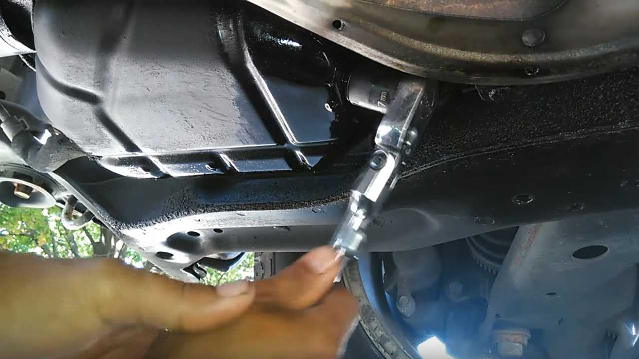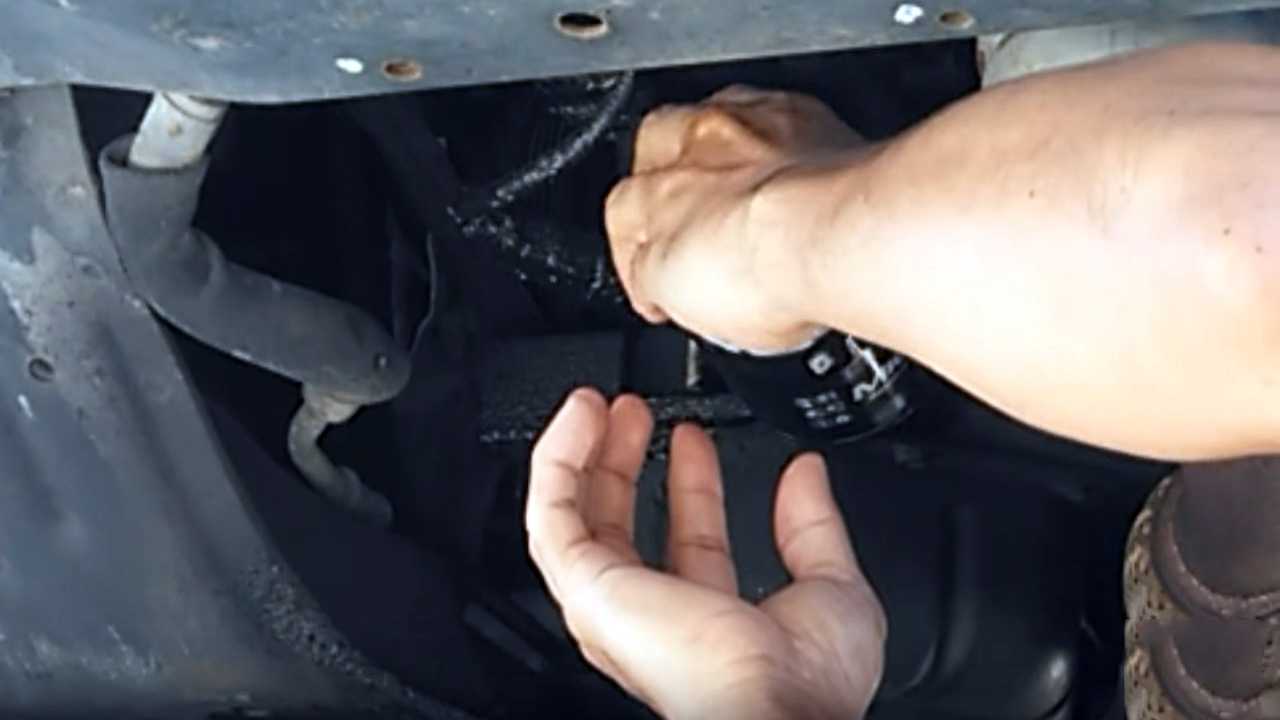 Головкой на 17 проверните пробку против часовой стрелки, чтобы слить старое масло. Будьте готовы что масло большим напором побежит из картера двигателя.