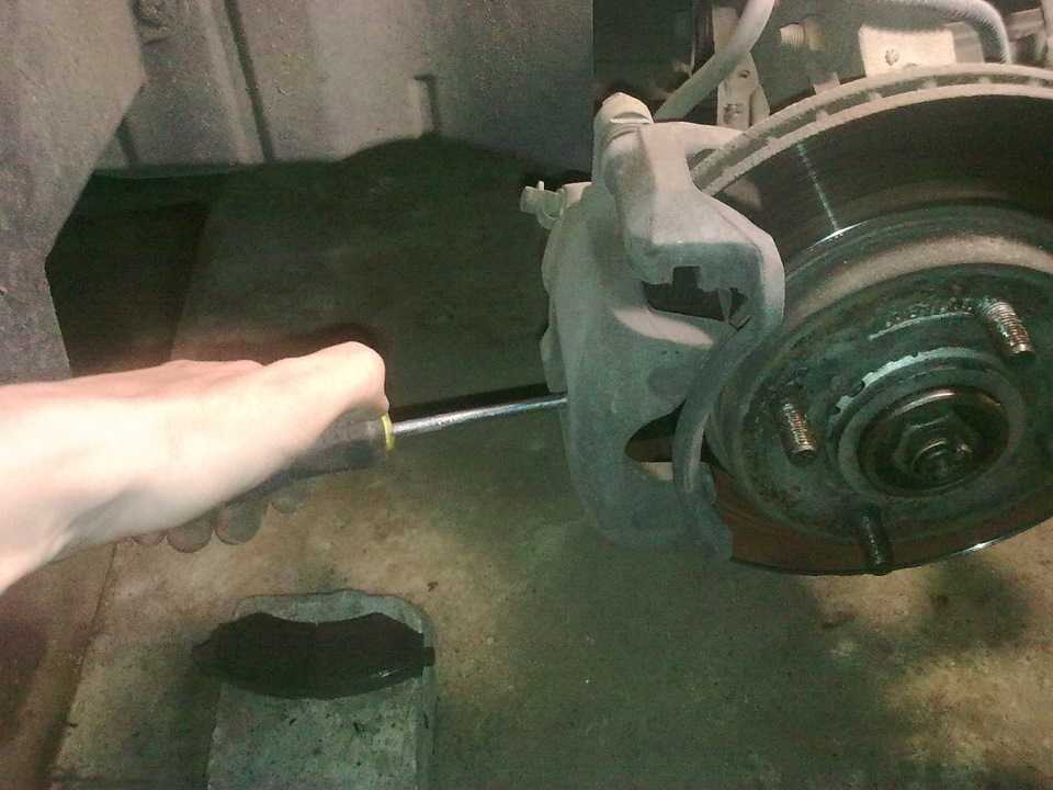 Вывешиваем переднюю часть машины и снимаем колесо. Вставив монтажную лопатку или отвертку с широким лезвием между направляющей колодок и суппортом и опираясь ею на направляющую сдвигаем суппорт, утапливая поршень в цилиндр. Это поможет нам легче вынуть старые колодки.