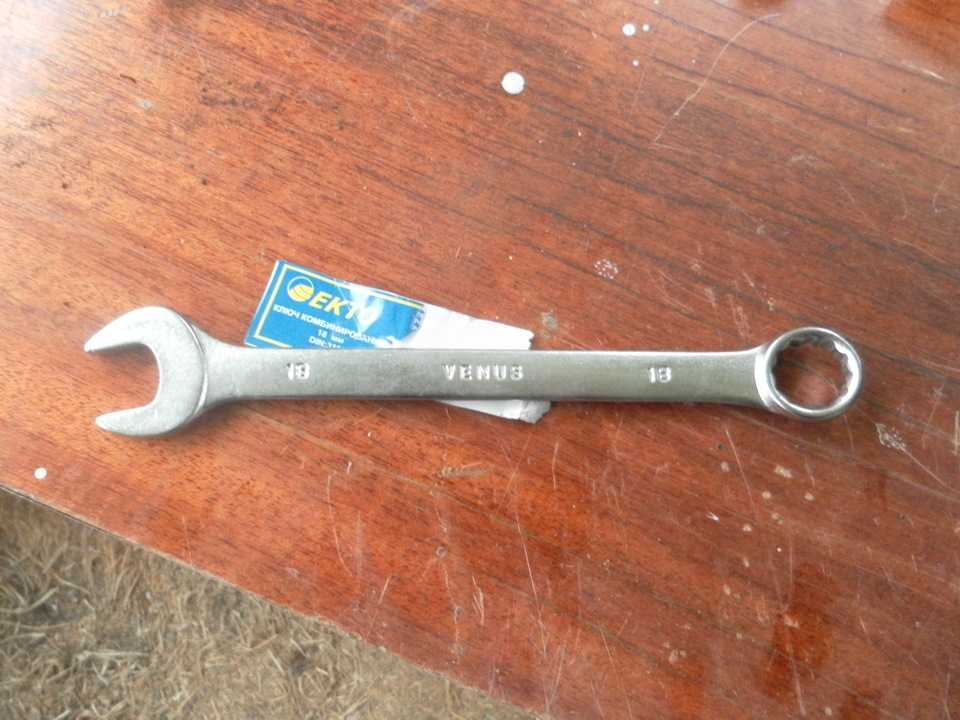 Используем рожковый ключ на «17» для удержания направляющего пальца и накидной ключ на «13» для отворачивания болта.