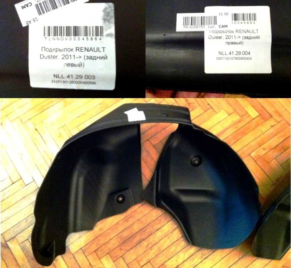 Артикульные номера оригинальных подкрылков и щитка на Дастер:7711547226 -крепление подкрылков (но в комплекте с подкрылками должен был идти 7711546874 ) — раньше было дорого, но теперь есть позиции по 40 рублей.7711546874 идёт без пистона (он и не нужен), стоит 24 рубля.638408322R — передний правый подкрылок, 950 рублей638419131R — передний левый подкрылок, 950 рублей7711548428 -левый задний подкрылок для 4wd, 1400 рублей (но взял оба подкрылка за 1500 руб)7711548429 — правый задний подкрылок для 4вд, 1400 рублей (но взял оба подкрылка за 1500 руб)6384500Q1D — пыльник двигателя левый от Ниссан Террано(а на самом деле это 638318745R ), от Ниссана 500 рублей, а от Рено 1 500 рублей.Итого вышло: 3 900 руб.