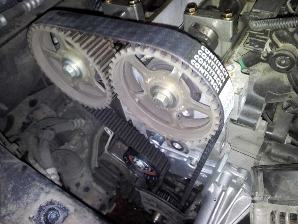 В начале вскользь об этом говорилось. Вся проблема состоит в том, что приходится снимать кожух ремня ГРМ, фиксировать валы, потом ослаблять ролик, потом снимать ремень, менять помпу, потом все собирать. Это гораздо сложнее, чем на рассмотренном нами двигателе.