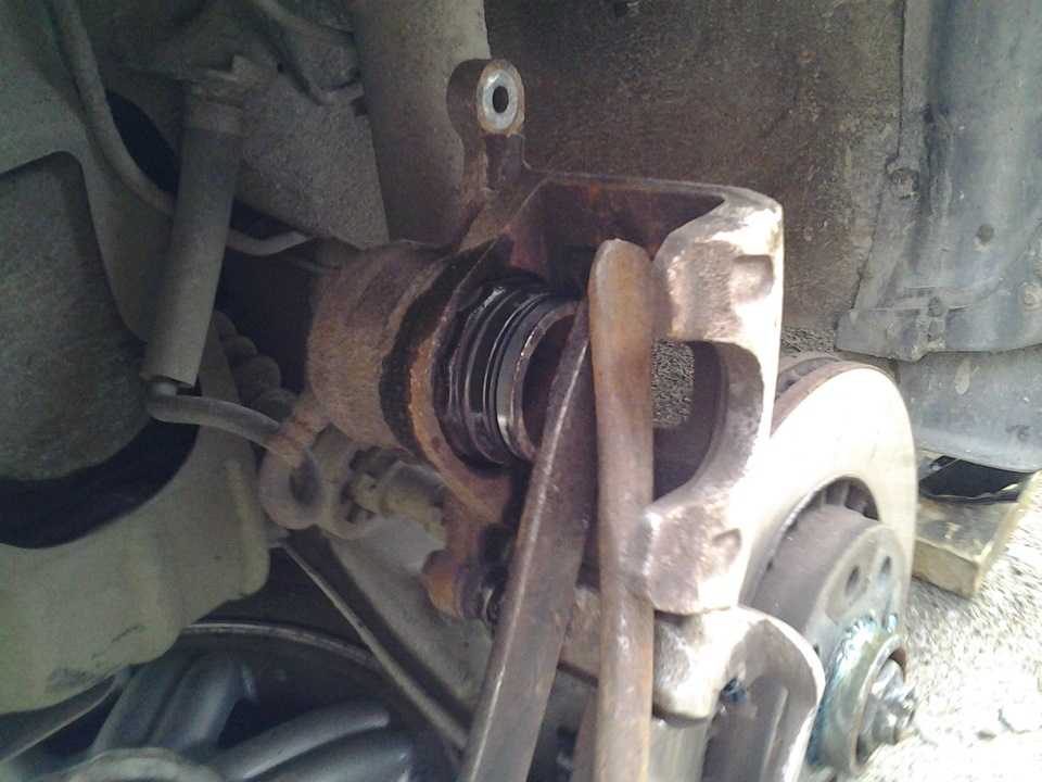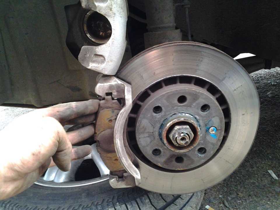 - Теперь приподнимаем заднюю часть транспортного средства и снимаем колесо. После разбираем тормозной механизм, отвинчиваем корпус и достаем тормозные колодки, предварительно отсоединив от верхней крючок, примыкающий к тросу от ручника. Теперь откроется доступ к тормозному диску, который также извлекаем, выкрутив все фиксирующие крепления;