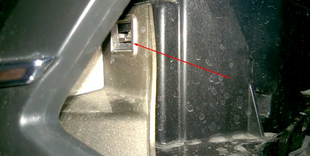 9. Нажмите язычок вниз и потяните решетку бампера на себя, чтобы разъединить защелку.