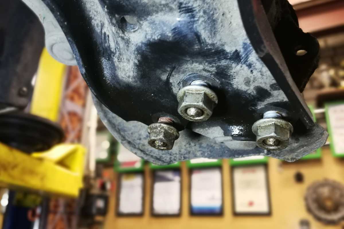 Вставляем болты. Но затягивать их можно только тогда, когда подвеска нагружена. То есть когда рычаг примет то положение относительно кузова, которое будет иметь, когда машина стоит на земле. Это положение можно сымитировать, подставив под рычаг в районе шаровой опоры стойку и опустив кузов так, чтобы лапа подъёмника освободилась.