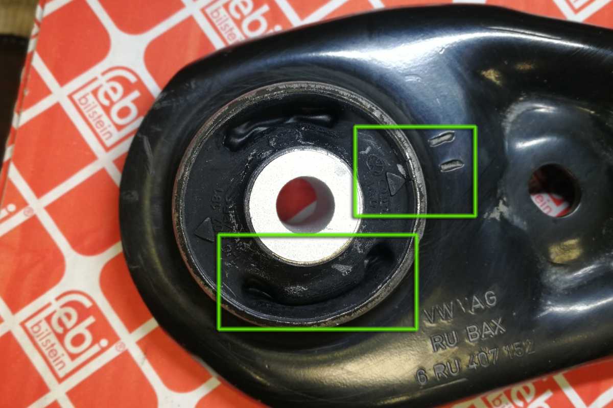 А теперь очень важный момент: как правильно ориентировать круглый сайлентблок в круглом же отверстии рычага? На самом сайлентблоки отлиты две стрелки, на рычаге есть ответные метки. Но если внимательно присмотреться, можно обнаружить, что сайлентблок не симметричный. Внутри у него одна отливка большей толщины, чем с другой стороны.