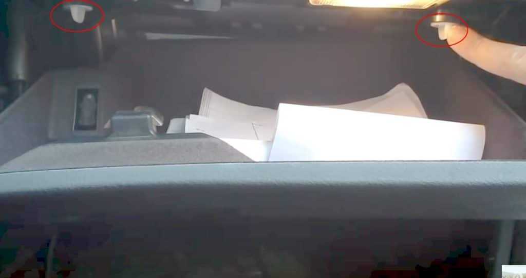 Далее открываем бардачок и находим белые зажимы, которые поворачиваем в левую сторону на 90 градусов.Удерживающие фиксаторы