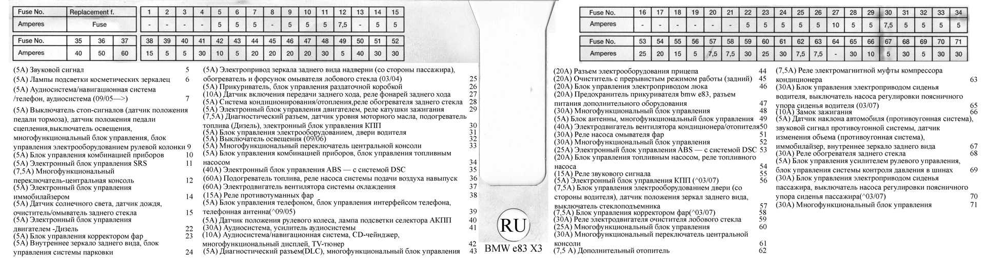 Благодаря тому, что валы привода передних колес проведены через масляный картер, в автомобиле обеспечивается очень низкий центр тяжести, что способствует сокращению боковых кренов. Независимое шасси X3 демонстрирует исключительные характеристики стабильности и жесткости при кручении, в то время как отдельно армированные боковые направляющие кузова перевод предохранителей бмв х3 е83 высокопрочный кокпит гарантируют максимальную защиту пассажиров.